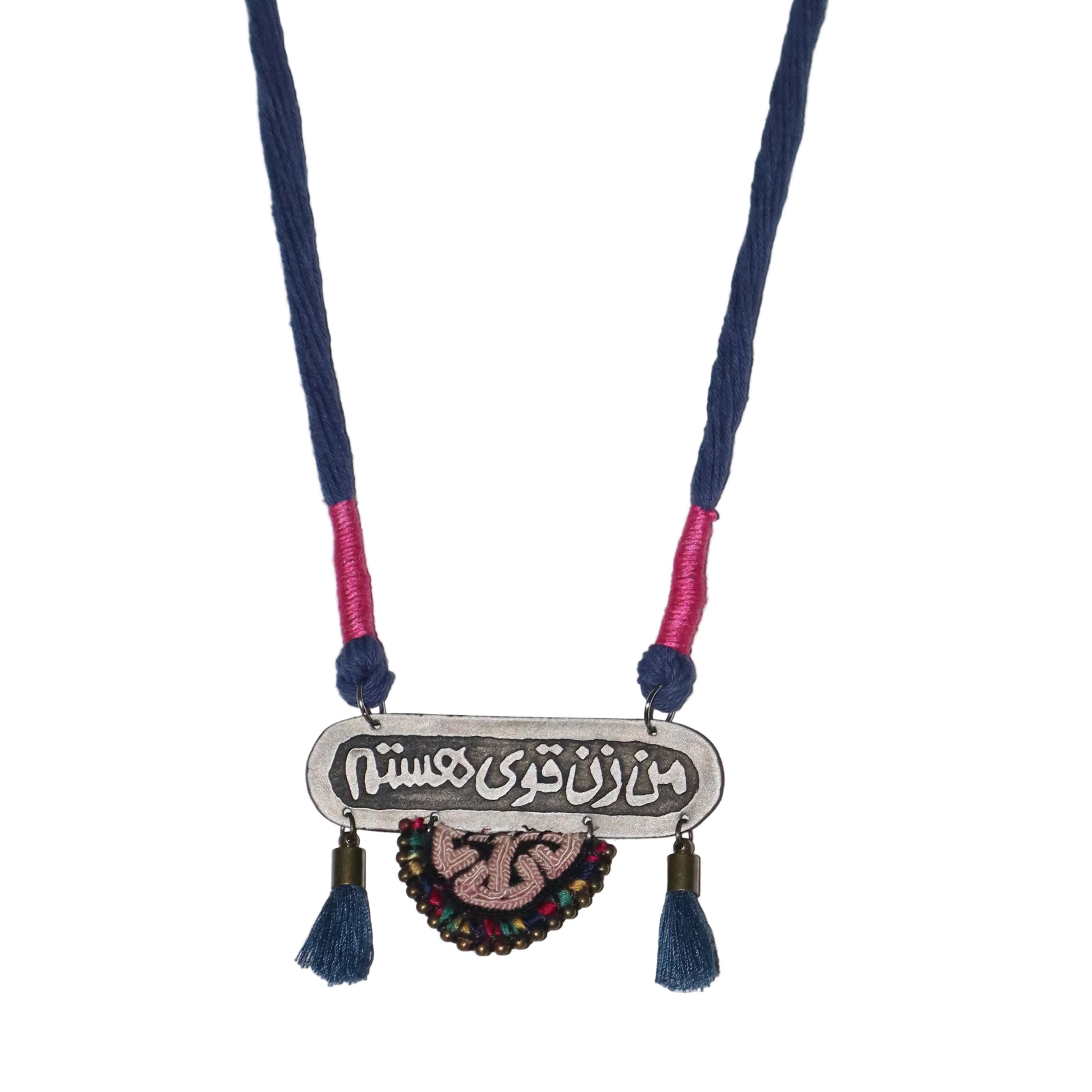 Handmade necklace bearing the sentence "I am a strong woman" finished with fabric cords